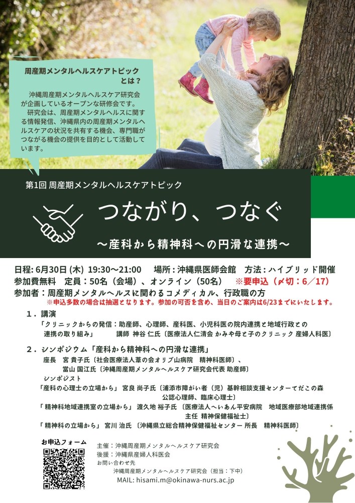 「沖縄周産期メンタルへルスケア研究会」は、周産期メンタルヘルスに関連した情報の共有や医療者間の連携・強化を図る目的で、2019年より研究会を発足し、活動を進めております。これまで、産婦人科医、精神科医、小児科医、助産師、保健師、心理師、社会福祉士、行政等多職種で、事例検討会や定期ミーティングを行ってまいりました。今回、周産期メンタルヘルスに関する啓発の一環として表記の通り講演会を開催することといたしました。ご多忙の折、誠に恐縮ですがご参加の皆さまのご参加をお待ちしております。