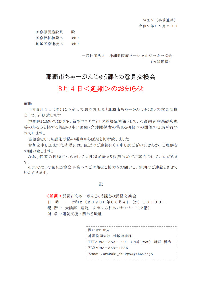 | 内容 | 沖縄県医療ソーシャルワーカー協会と那覇市ちゃーがんじゅう課により、要介護認定を通して、医療・介護のよりスムーズな連携を模索してきました。今回、約3年にわたる活動の報告として、機会を設けたいと思います。 |